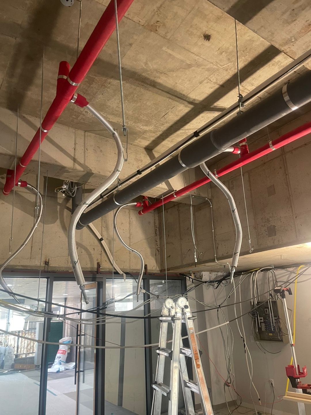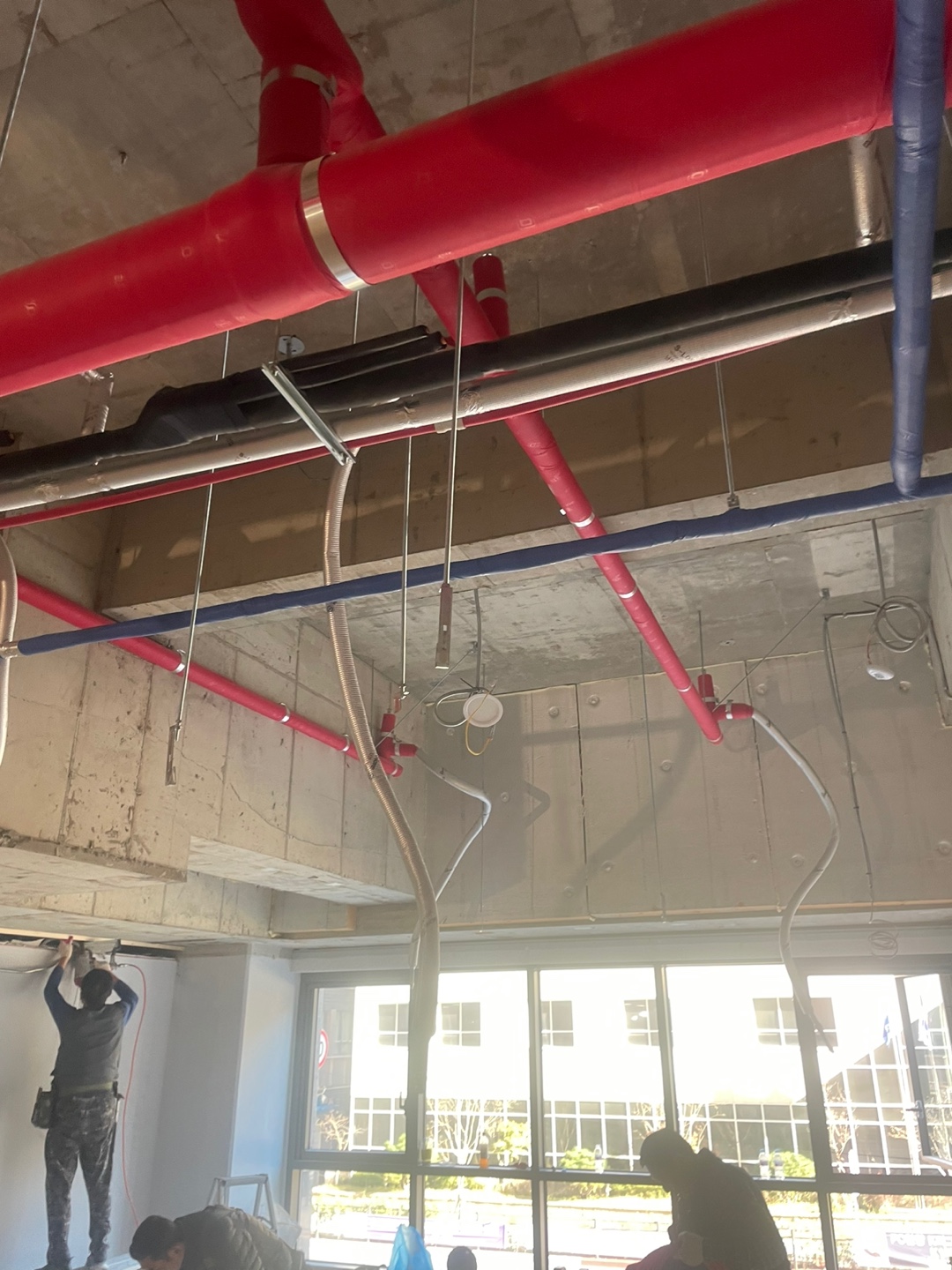 이렇게 상하향식으로 되어있던 배관은 천장 마감을 철거하고 오픈천장 형태로 변경하기 때문에, 하향식으로 나와있는 신축배관은 철거가 이루어져야 합니다. 그렇게 하향식 배관을 철거하고 상향식 배관만 남겨놓는 작업을 진행하였습니다.