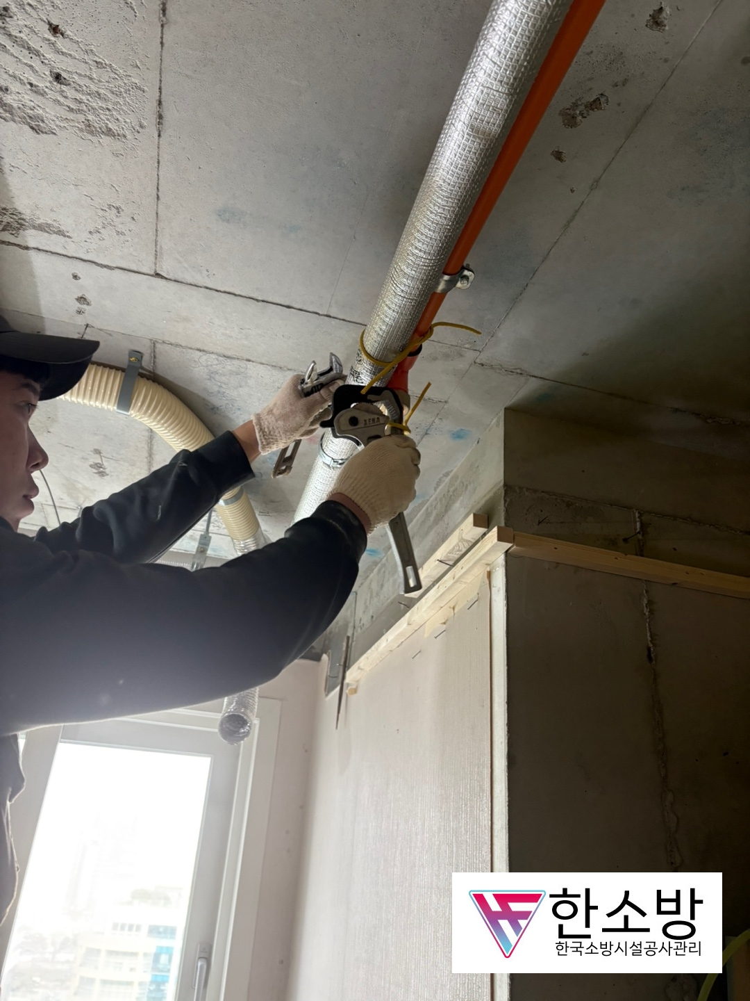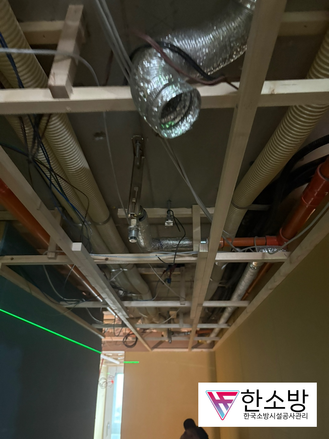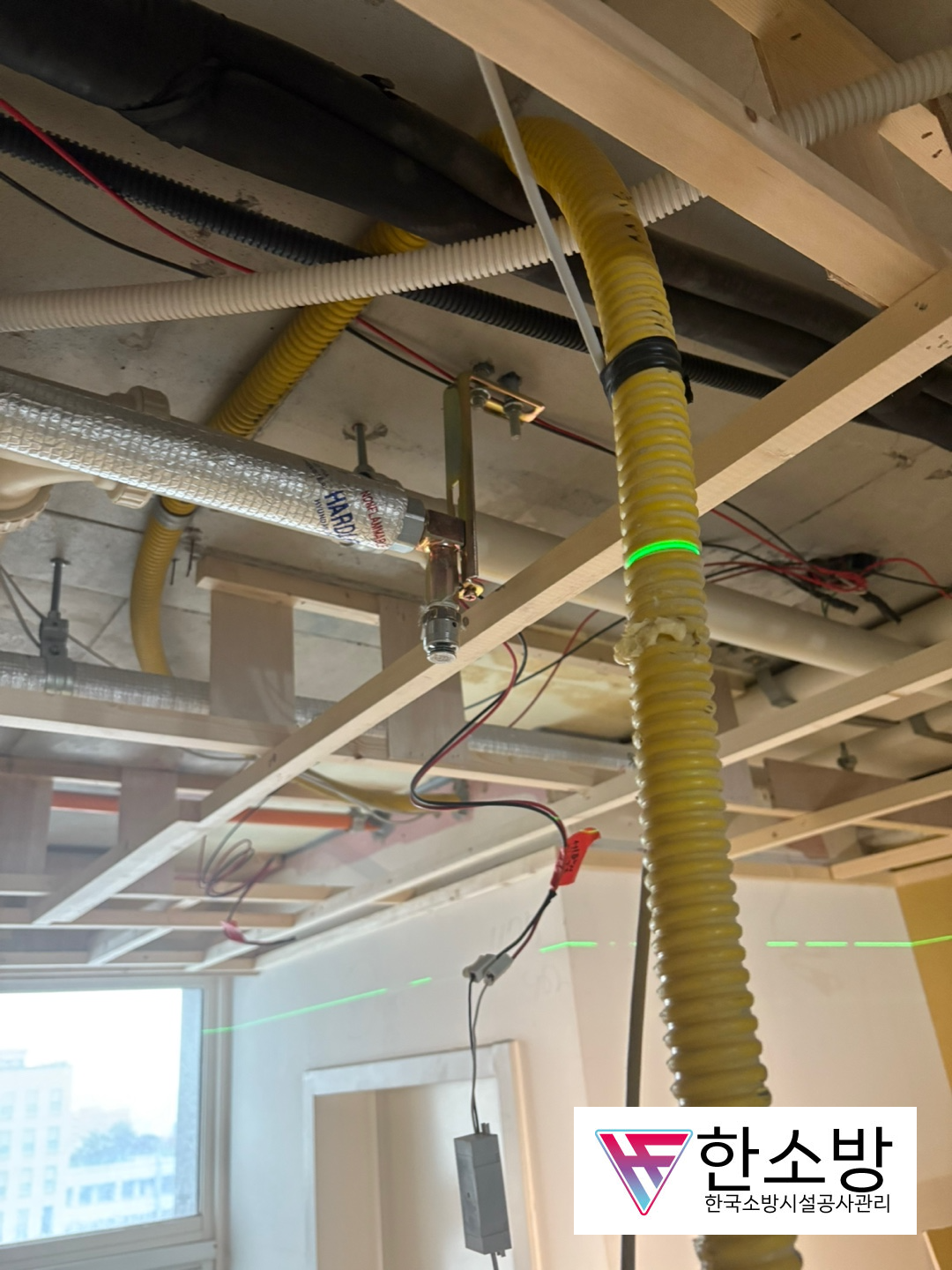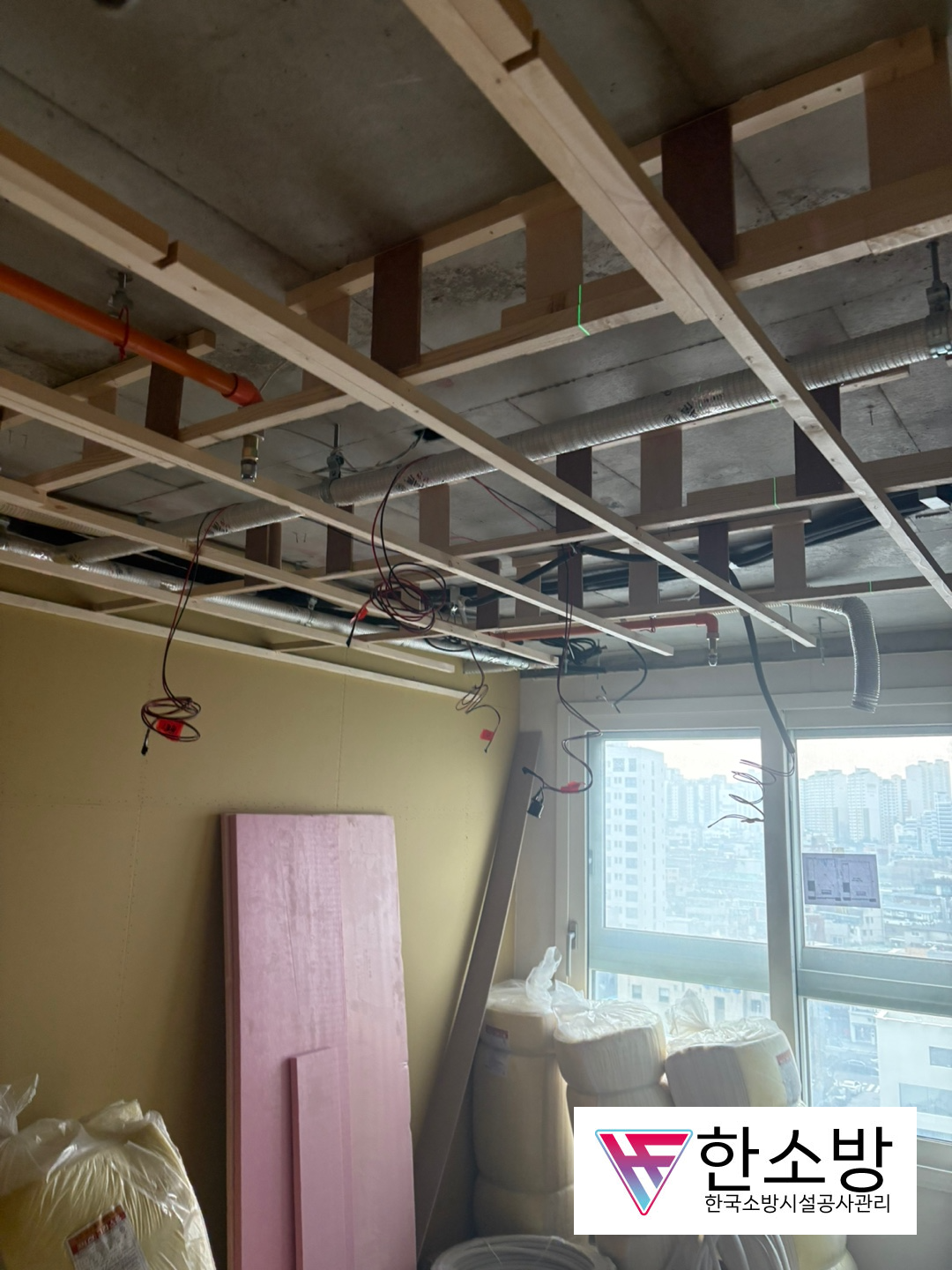현장에 갔을 때는 여기저기 모든 철거를 하고 목수분들이, 여러 가지 뼈대와 벽, 그리고 천장을 만들고 있었습니다. 그중에서 저렇게 합성수지배관(CPVC) 로 된 소방배관이 공사에 차질이 될 것 같다고 생각을 하였습니다.