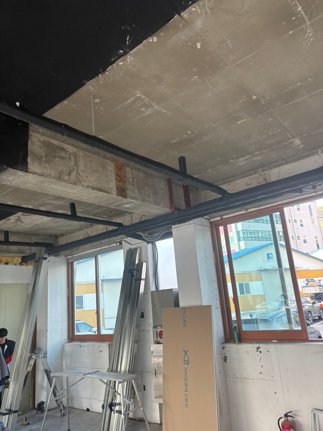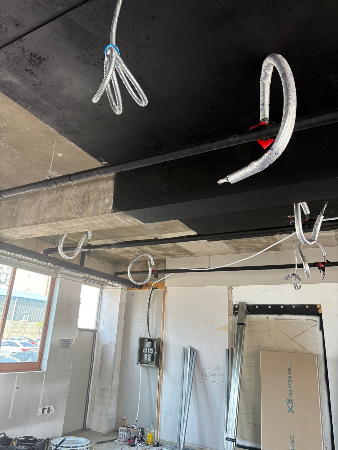 스프링클러는 기존에 노출천장으로 되어있었기 때문에, 상향식 스프링클러 배관을 모두 철거해줍니다. 철거한 이후에 하향식 스프링클러로 교체를 해야되기 때문에, 하향식 신축배관 형태의 배관으로 교체를 해줘야합니다.