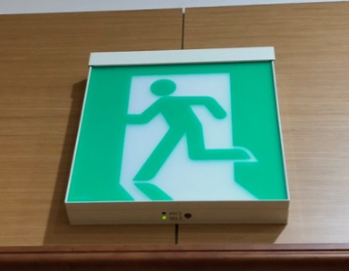 2. 피난층으로 향하는 피난구위 위치를 안내할 수 있도록 출입구 인근 천장에 설치된 피난구유도등의 면과 수직이 되도록 피난구 유도등을 추가 설치하거나 입체형 피난구유도등을 설치한다.