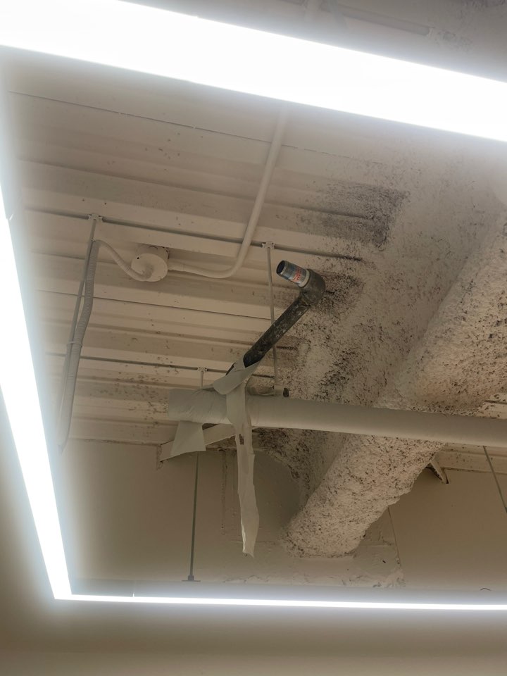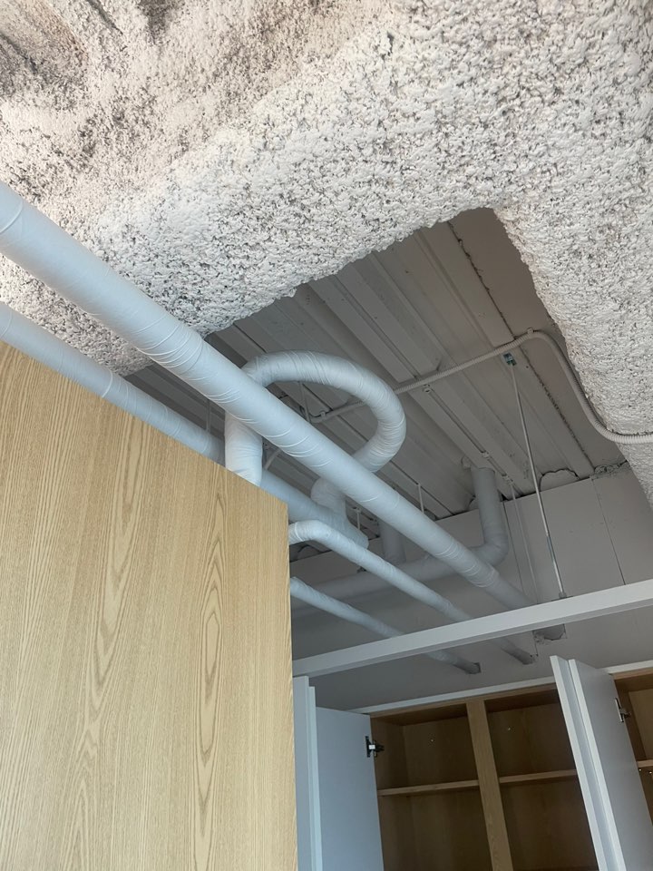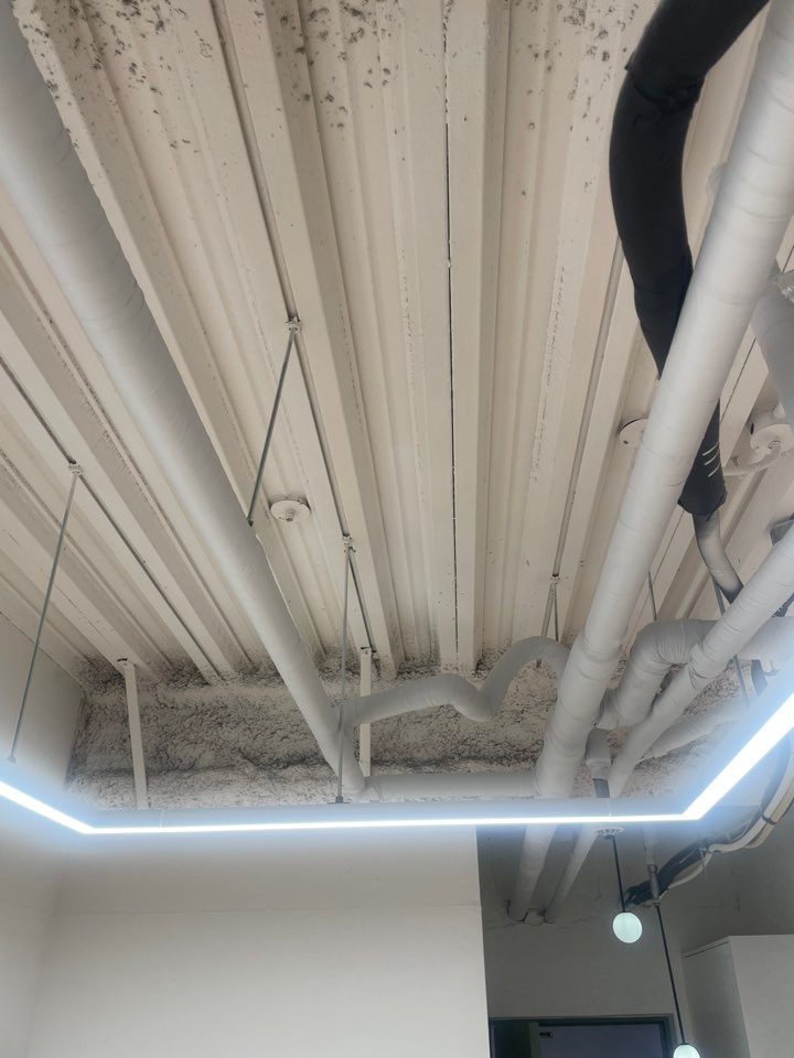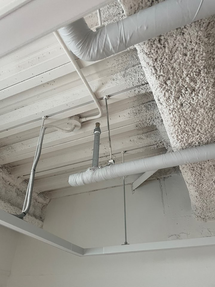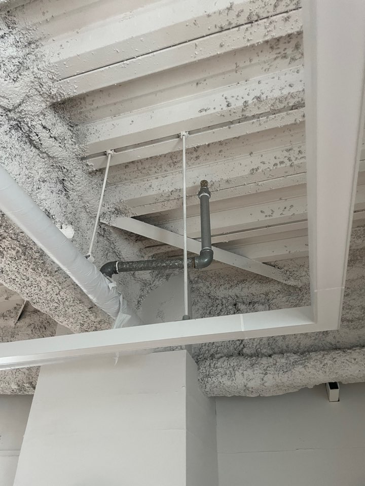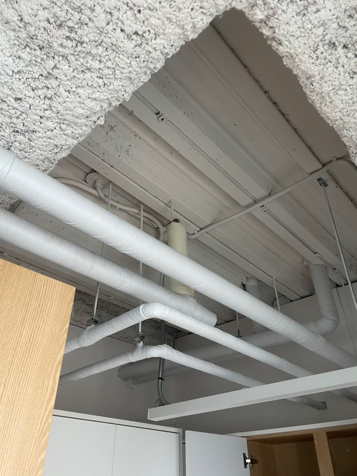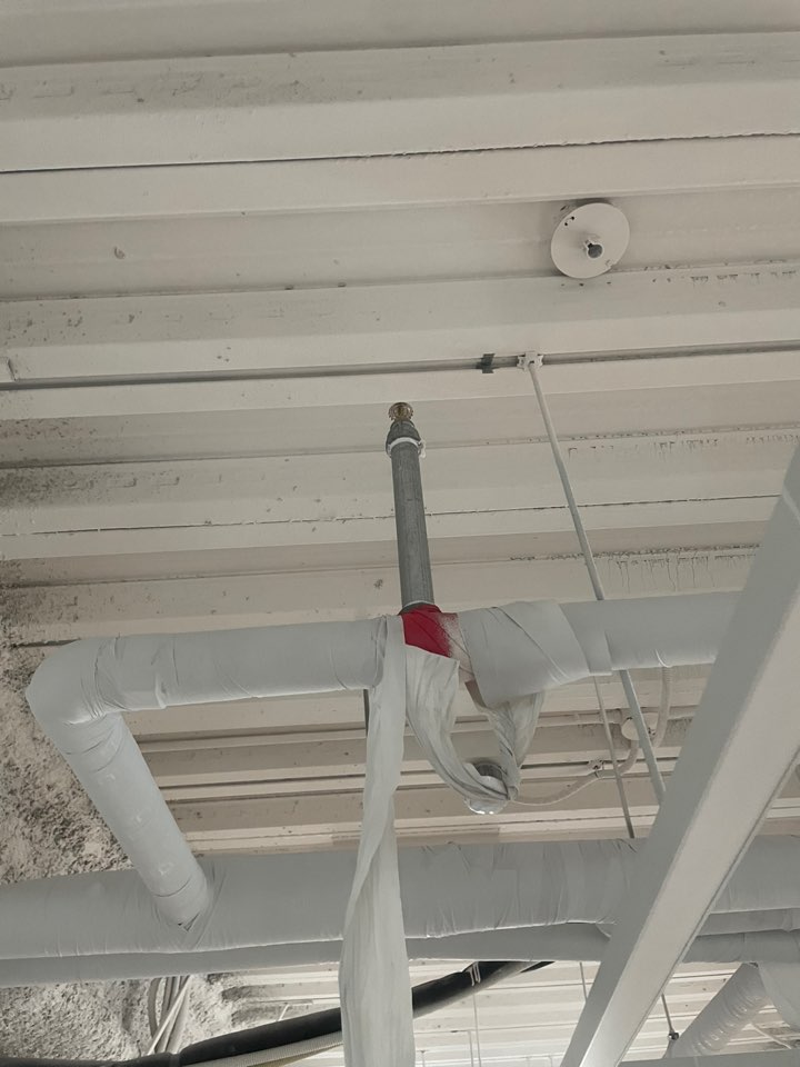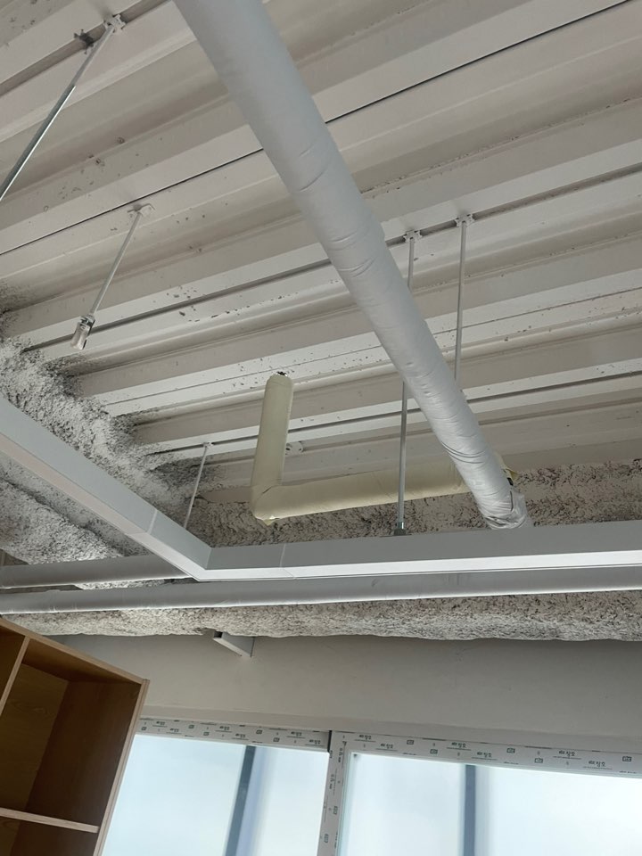 현장에서는 천장이 오픈되어있었는데, 스프링클러 배관은 이전에 사용했던 신축배관 그대로 설치가 되어있었습니다. 이러한 신축배관은 천장이 없을때 고정이 어렵기때문에, 상향식 스프링클러 배관으로 교체를 해줘야합니다.